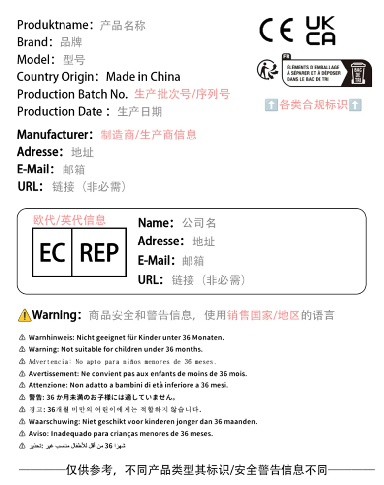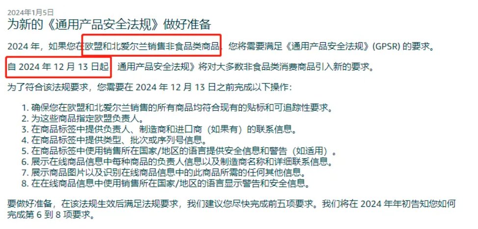 亚马逊:自2024年12月13日起在欧盟和北爱尔兰销售的大多非食品产品(含CE和非CE类)均需满足GPSR。除了需要在亚马逊上传欧代及制造商信息以外,还需要上传商品标签中类型、批次、序列号以及安全与警告信息。