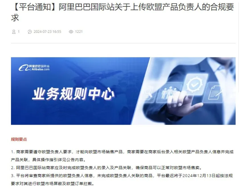 2. 阿里巴巴国际站商家应及时完成欧盟负责人的录入及产品关联,确保商品可以正常对欧盟市场售卖。