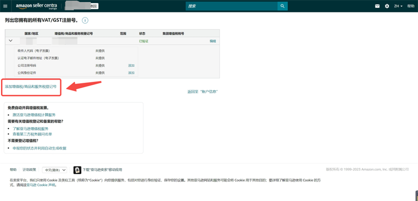 或者点击【设置】-【账户信息】-【税务信息】-【VAT/GST注册编号】