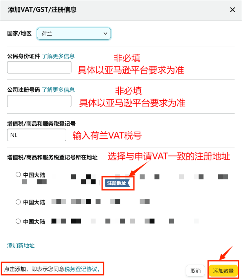 第三步:选择国家/地区为【荷兰】,输入荷兰VAT税号,最后选择与申请VAT一致的地址,如果没有就点击【添加新地址】,手动输入对应地址,点击【添加数量】。